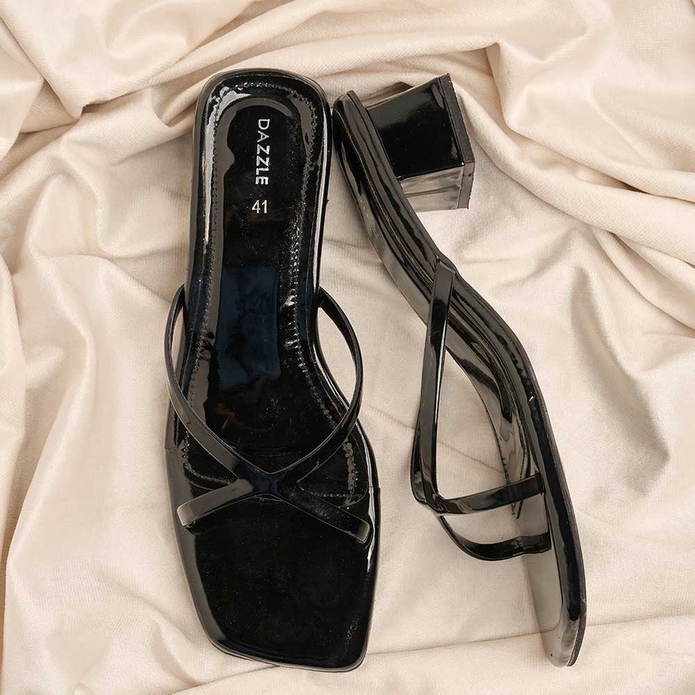 This sleek black slipper heel features a glossy finish with elegant crisscross straps, designed for both comfort and style. Its modern square toe shape adds a contemporary edge, making it perfect for versatile wear.