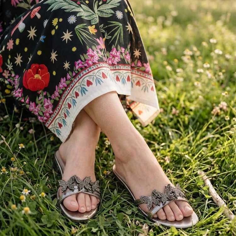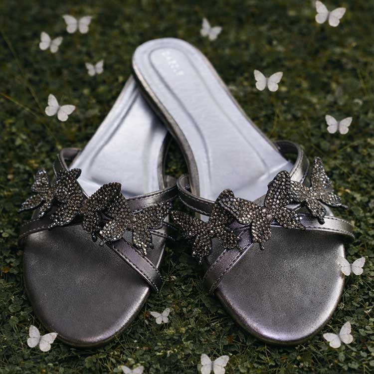 Draped in smoldering grey tones, these sleek slides are adorned with glittering dark butterfly clusters that add a touch of mysterious glamour to every effortless step.
