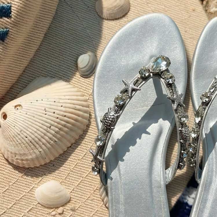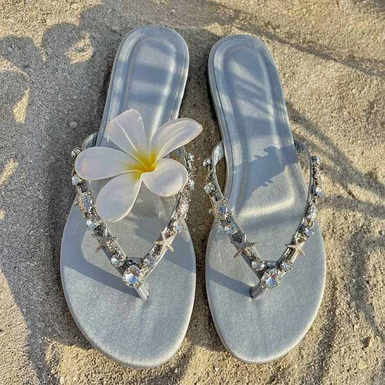 Sleek grey flip flops dressed up with sparkling jewel-like embellishments on the strap, these elegant flats are the perfect mix of comfort and glamour. Easy to wear yet totally stunning, they will make your feet shine at any casual outing or summer celebration.