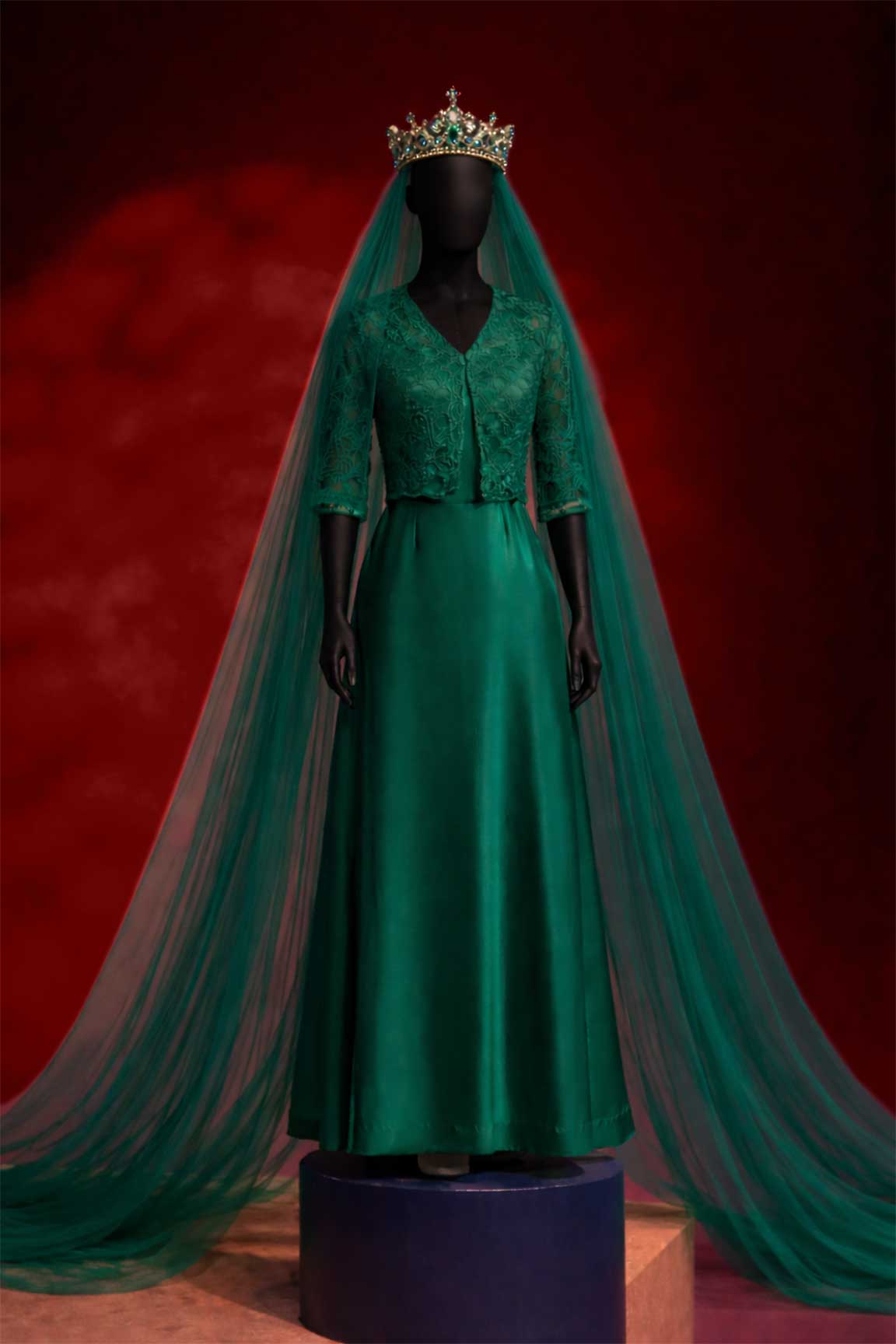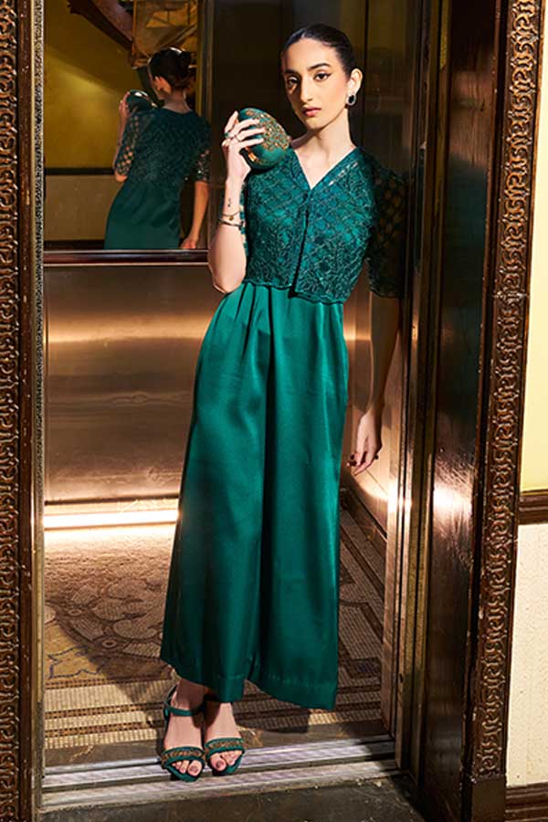 Radiating refined charm, “Emerald Whisper” is a vision of poise and modern grace. The deep green hue embodies two piece elegance comes with a net shrug and silk A-line cut dress, while the tailored flow creates a striking yet effortless silhouette. A perfect pick for evenings that call for sophistication wrapped in timeless beauty.