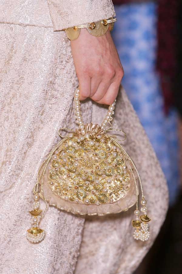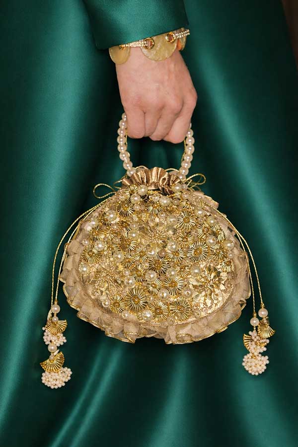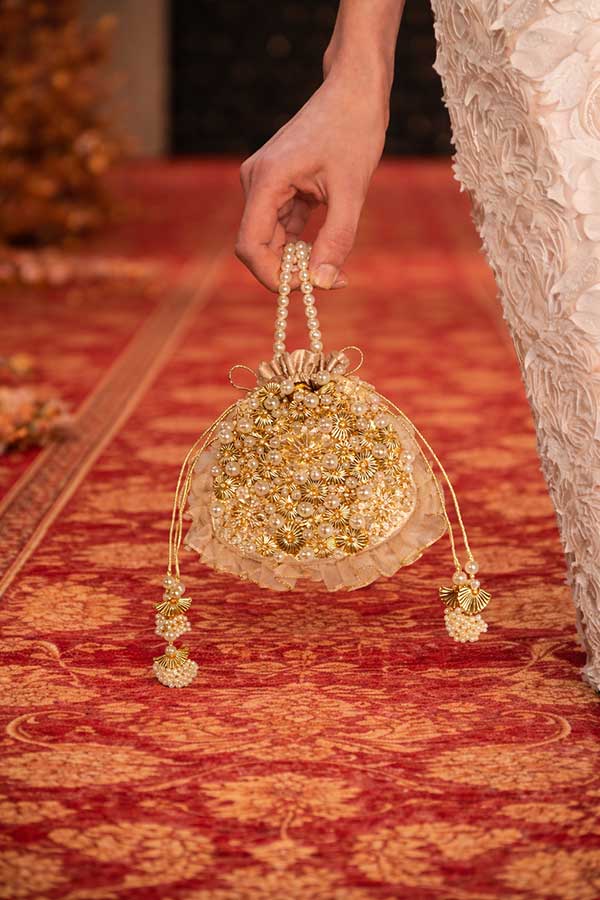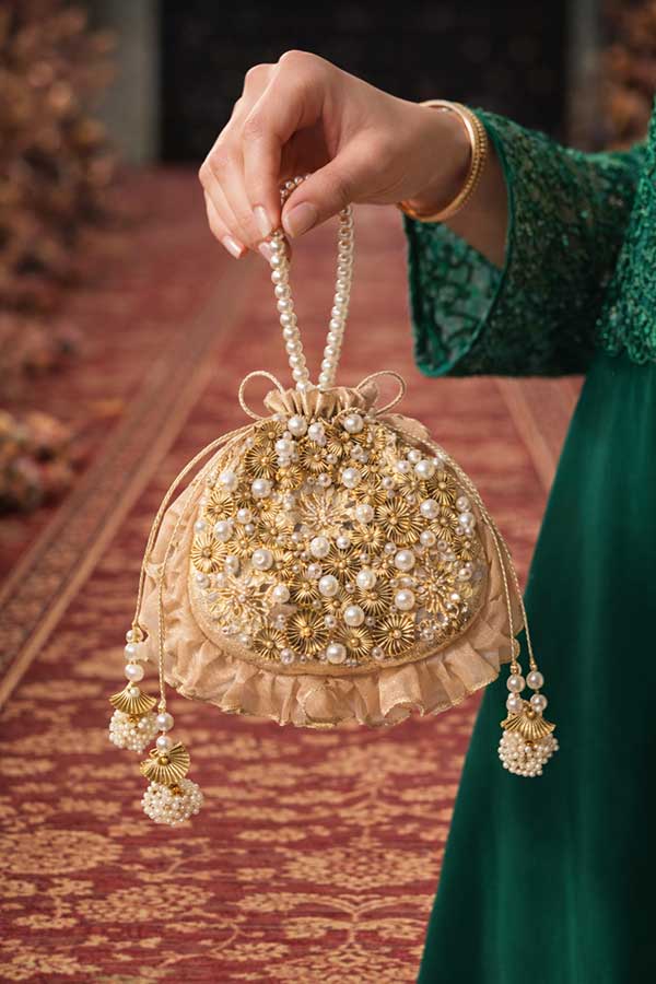 “Gotta Darling” is a dreamy blend of modern and desi with pearls, shimmer, and soft elegance. Adorned with delicate gotta work, floral detailing, and cascading pearls, this potli feels straight out of a fairytale. It comes with pearl handle for making it comfortable to carry around. Perfect for weddings and festive nights where every detail deserves to sparkle.