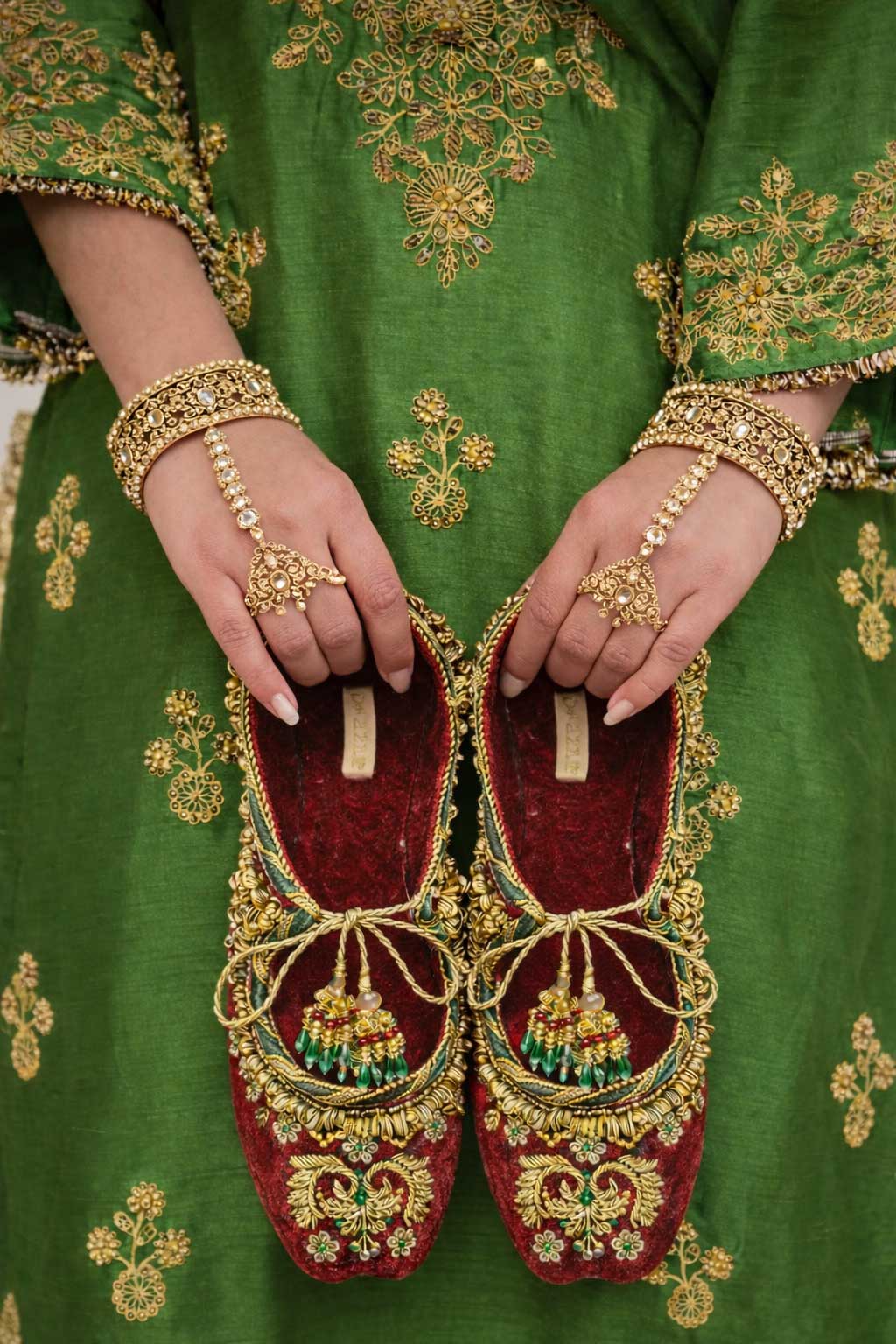 “Mughalia” feels like a step into a royal fairytale, crafted in rich maroon velvet with intricate gold embroidery inspired by Mughal artistry. The delicate front tassels add a touch of fantasy, making it a statement piece for weddings and celebrations where elegance meets enchantment.