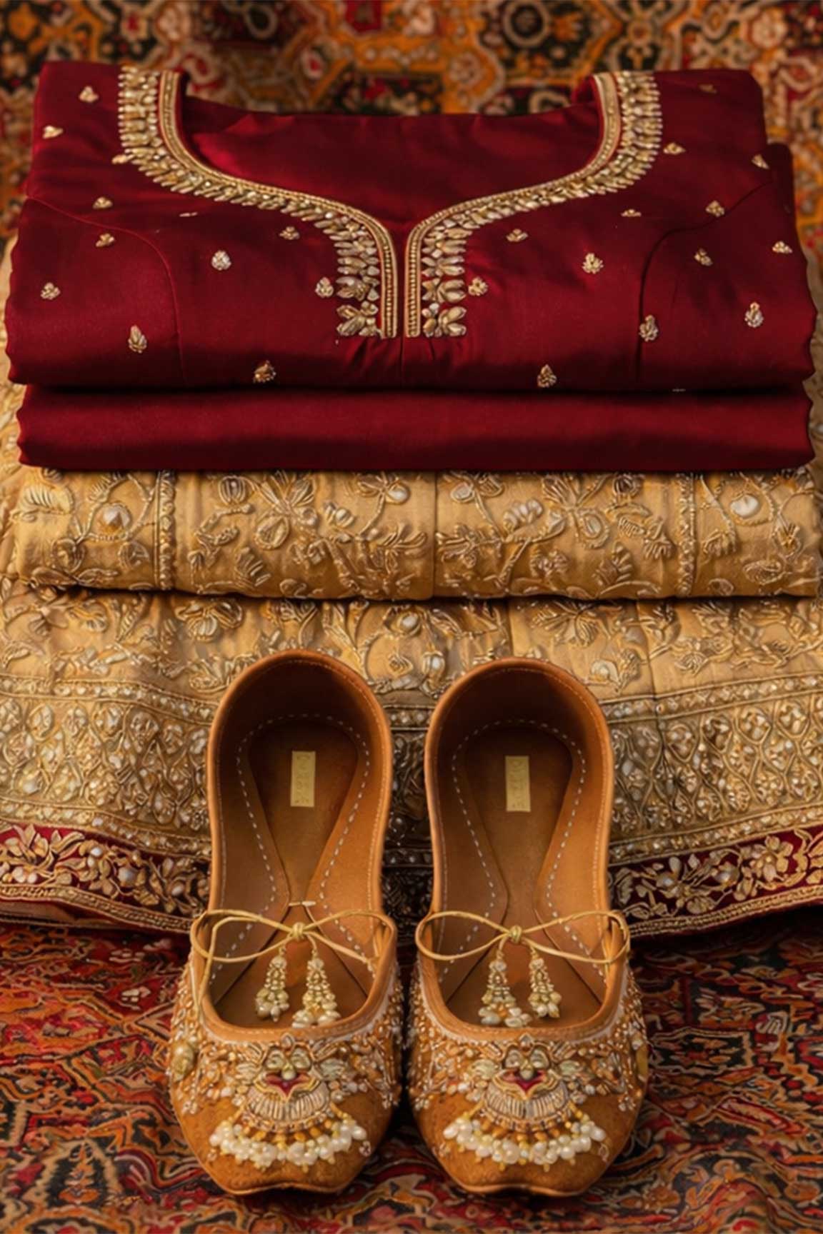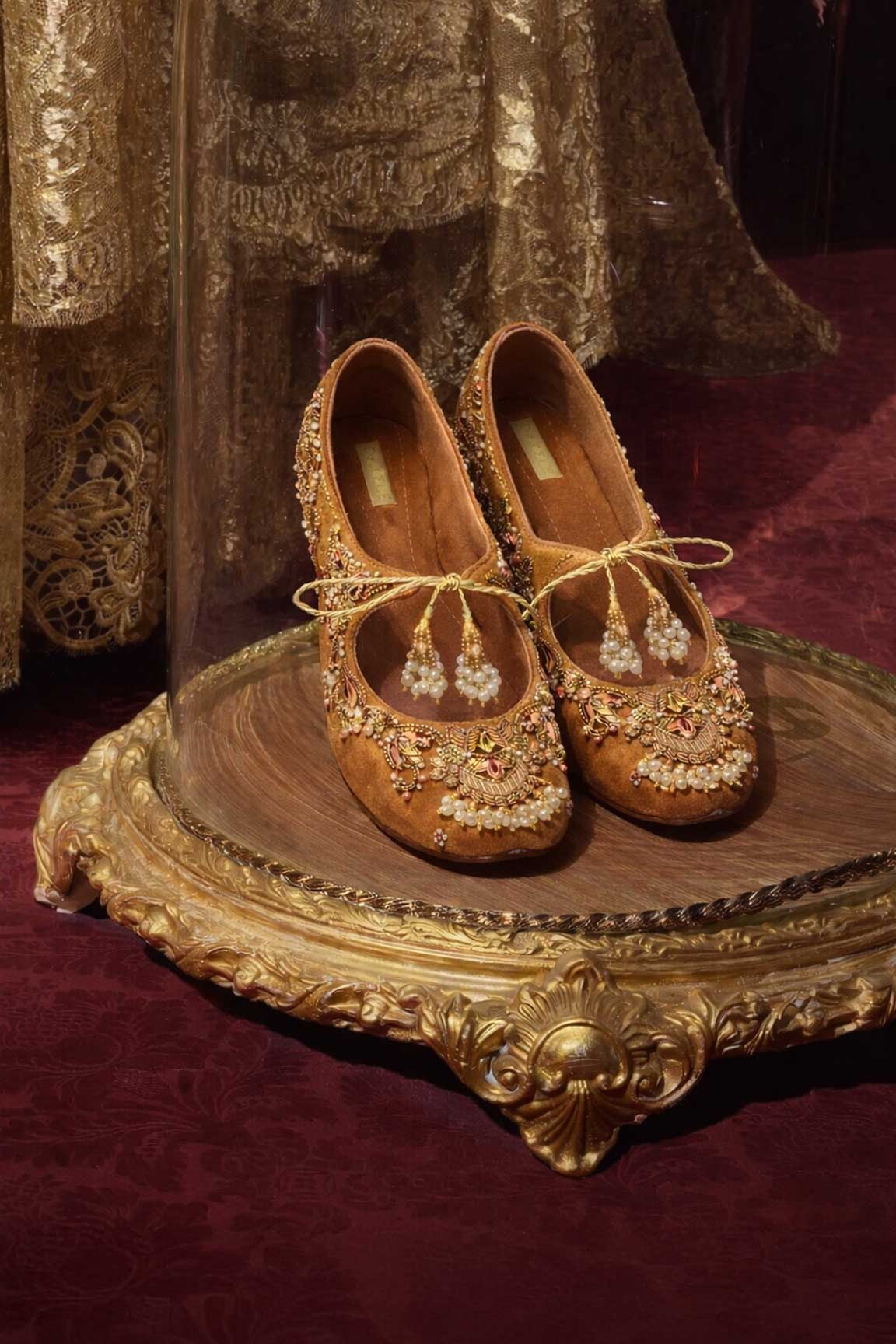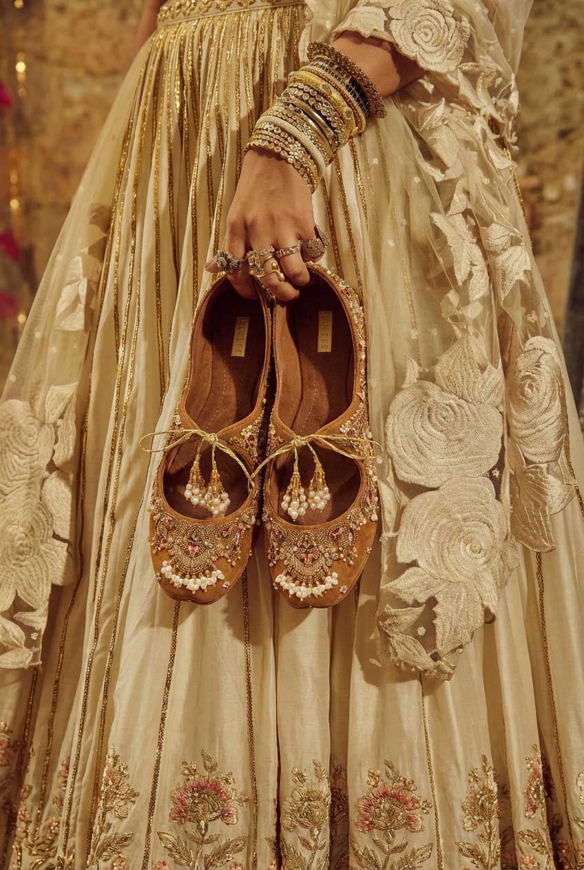 Drenched in warm hues, this embellished khussa is a celebration of artisanal beauty. Intricately adorned with pearls, crystals, and delicate gold detailing, it adds instant festive flair. A graceful silhouette designed to shine at weddings, soirées, and special occasions.