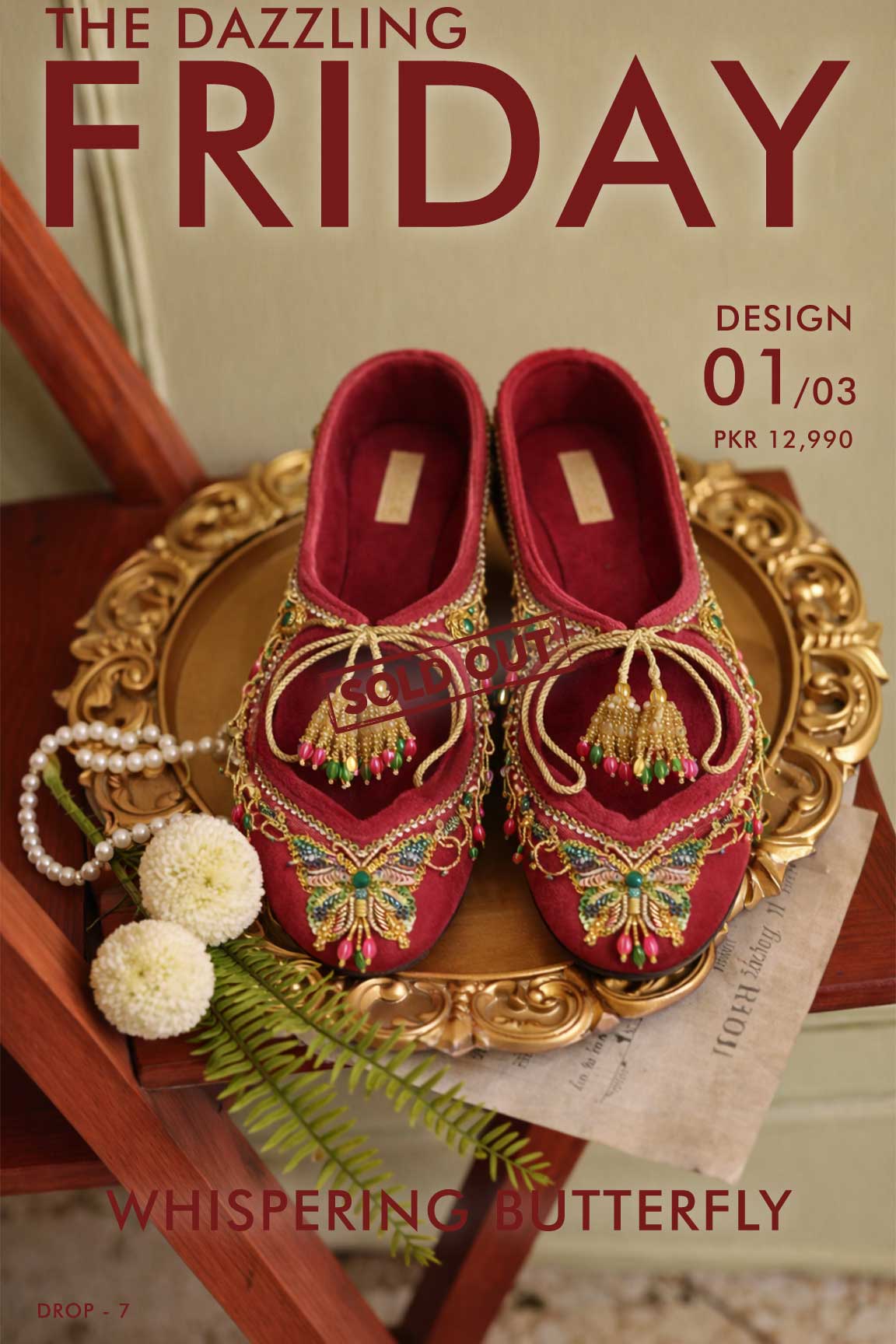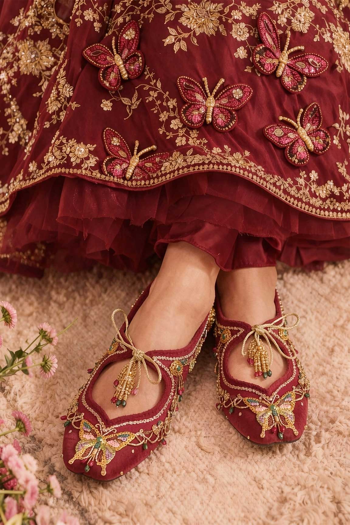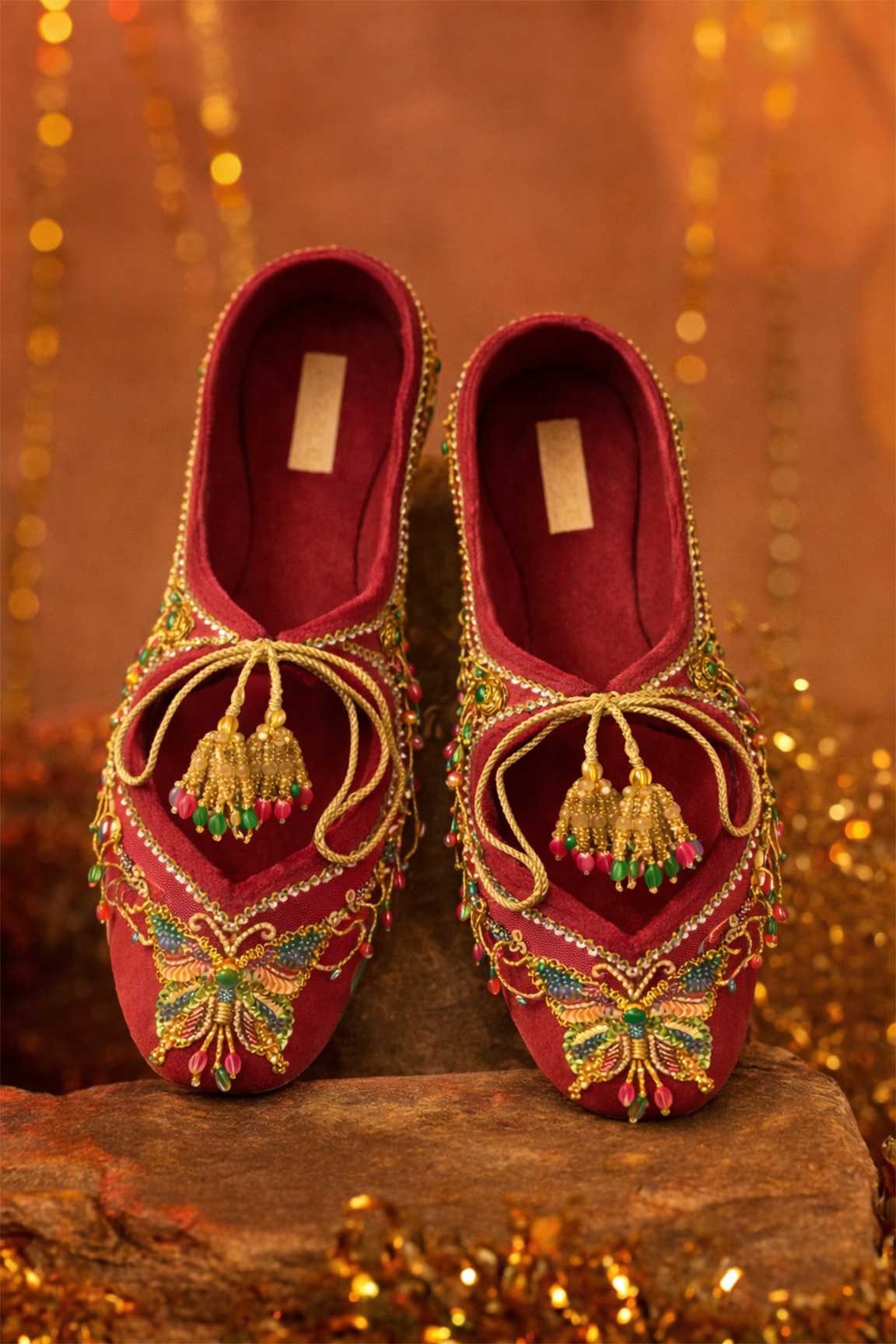A poetic blend of color and craftsmanship, “Whispering Butterfly” blooms in rich pink hue with delicate butterfly-inspired embellishments. Finished with shimmering beads and graceful tassel ties, this pair feels light, dreamy, and enchanting. Perfect for festive moments where elegance flutters softly with every step.
