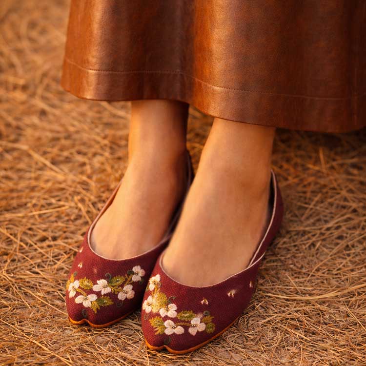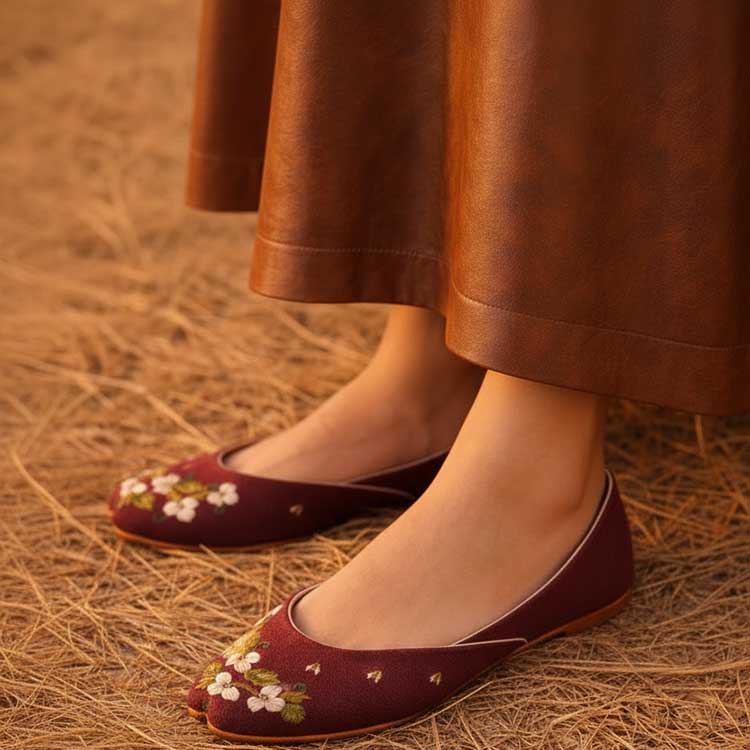 A vibrant maroon khussa adorned with delicate white floral embroidery for a fresh, artisanal touch. Crafted with soft lining and a classic curve, it pairs everyday comfort with timeless charm. Perfect for festive days, casual outings, or effortless elegance.