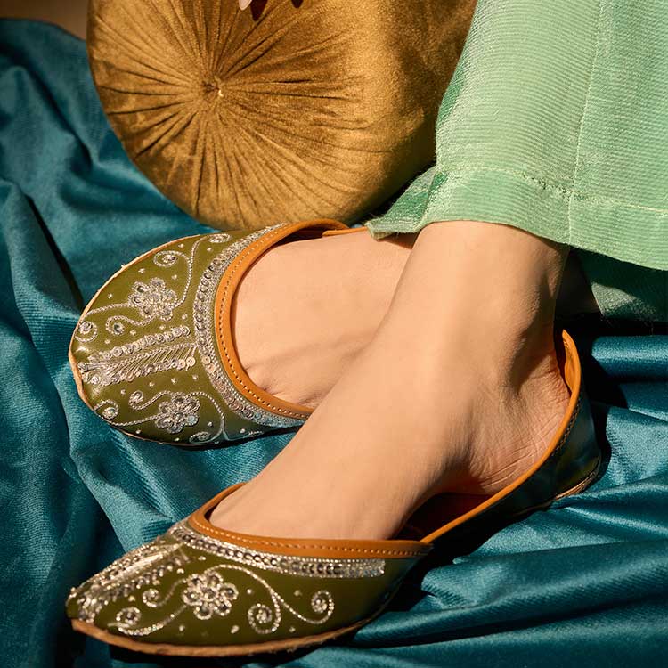 Rosheen features a rich olive-green base beautifully adorned with delicate silver tilla work. The floral and swirl patterns bring a graceful shimmer to every step. Its detailed upper design makes it perfect for festive and formal looks.
