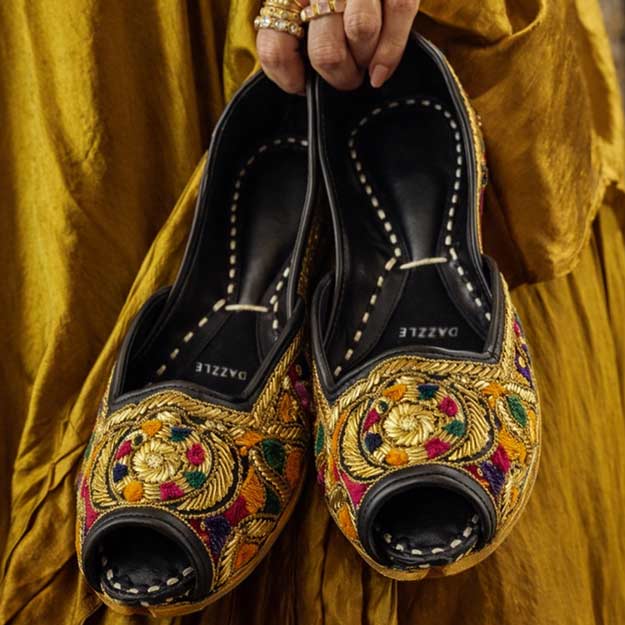 “Zarqand”, a striking handcrafted khussa featuring bold multicolor embroidery highlighted with golden work. Designed with a classic silhouette and cushioned comfort, it brings cultural artistry and modern flair together. A standout pick for festive looks, weddings, and statement everyday styling.