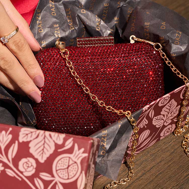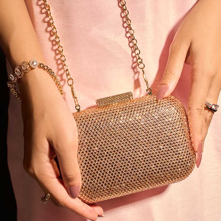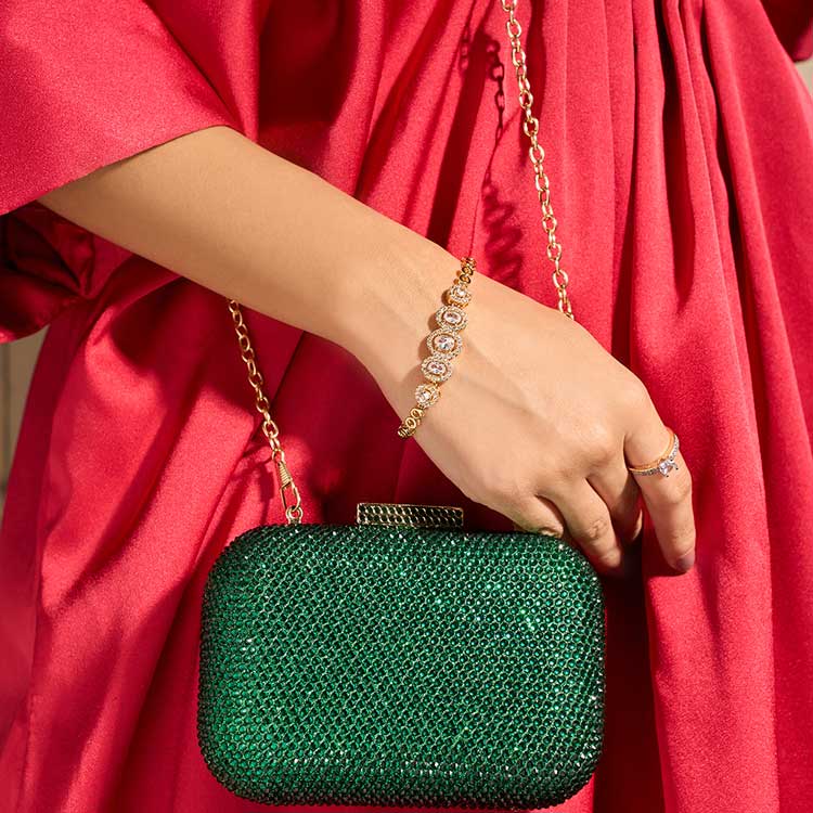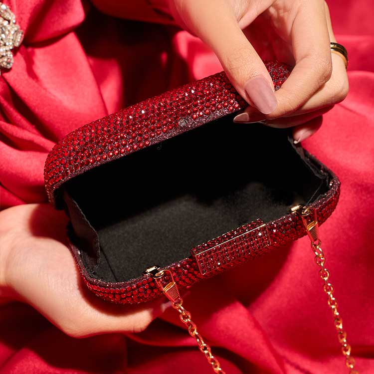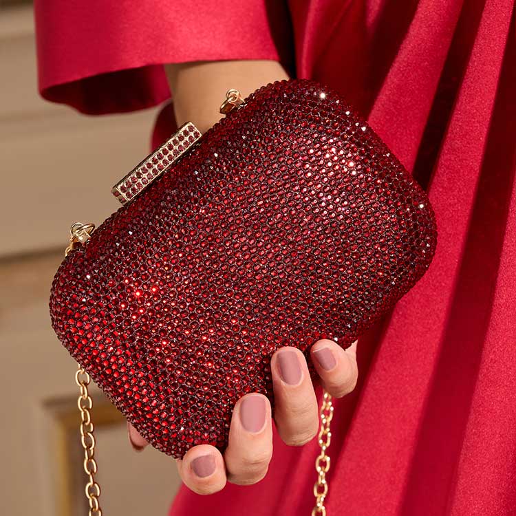 This chic clutch, crafted in a rectangular shape with softly rounded corners, dazzles with shimmering rhinestones. Paired with a sleek chain, it exudes modern elegance with a touch of regal charm. A perfect accessory to elevate evening looks with jewel-toned sophistication.