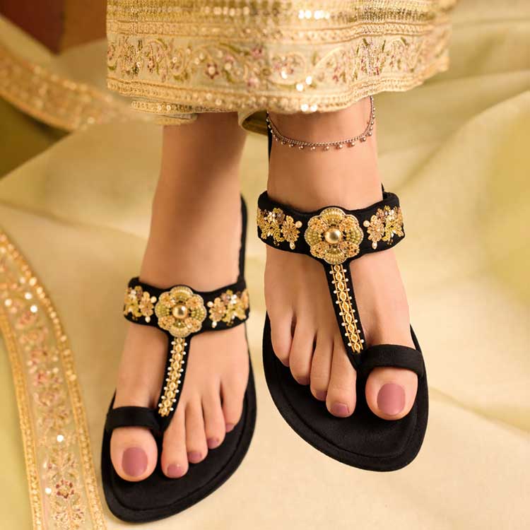 Bagula Kolhapuri comes in a classic black shade, beautifully detailed with handwork and intricately embellished flowers for a luxurious finish. Handcrafted with care, it combines traditional artistry with modern elegance. Perfect for weddings, festive events, or special occasions.