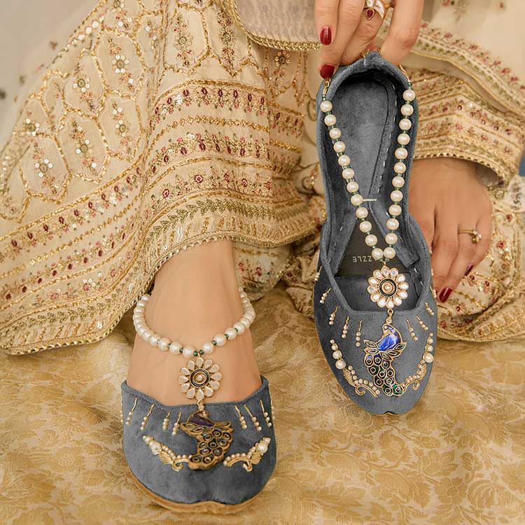 Husna-e-Jahan features a flamboyant peacock sitting in all its glory on a royal green velvet base! The motif is handcrafted with metal and rare art of meenakari̢ is done on its feather to enhance its gorgeous details. A Kundan floral motif holding the peacock and the pearl anklet together adds to the magnificence of Husna-e-Jahan.