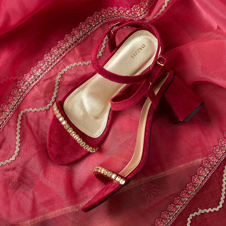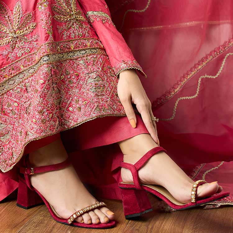 The Saj Dhaj formal heel comes in a rich maroon color with dazzling stone work on a single strap. Stylish and comfortable, it's perfect for weddings, festive events, and special occasions.